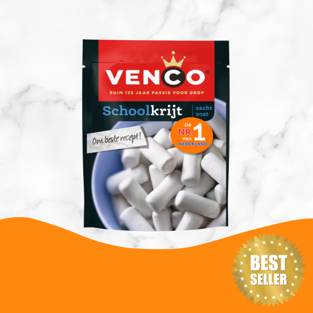 Venco Schoolkrijt is een uitmuntende, mintgecoate witte stokdrop die iedere connaisseur geproefd moet hebben. Het heeft een originele zachte en zoete anijssmaak.