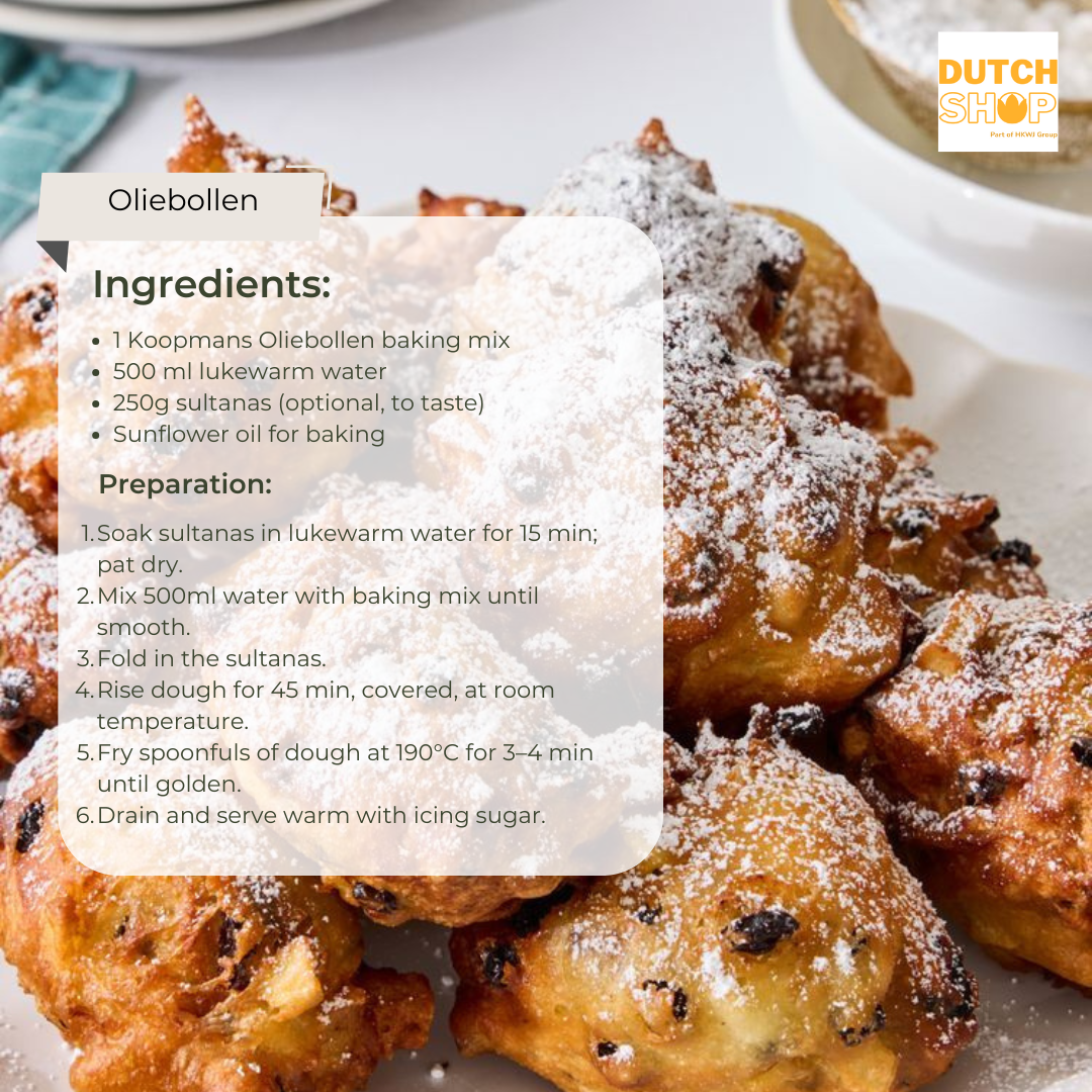 With Koopmans Oliebollen you can make a dough for the traditional Oliebollen from Holland in no time at all. Oliebollen are traditionally eaten in the Netherlands on New Year's Eve, Oudejaarsavond. Between Christmas and New Year's Day, the delicious balls are sold at many stalls outside supermarkets, at markets and in bakeries.