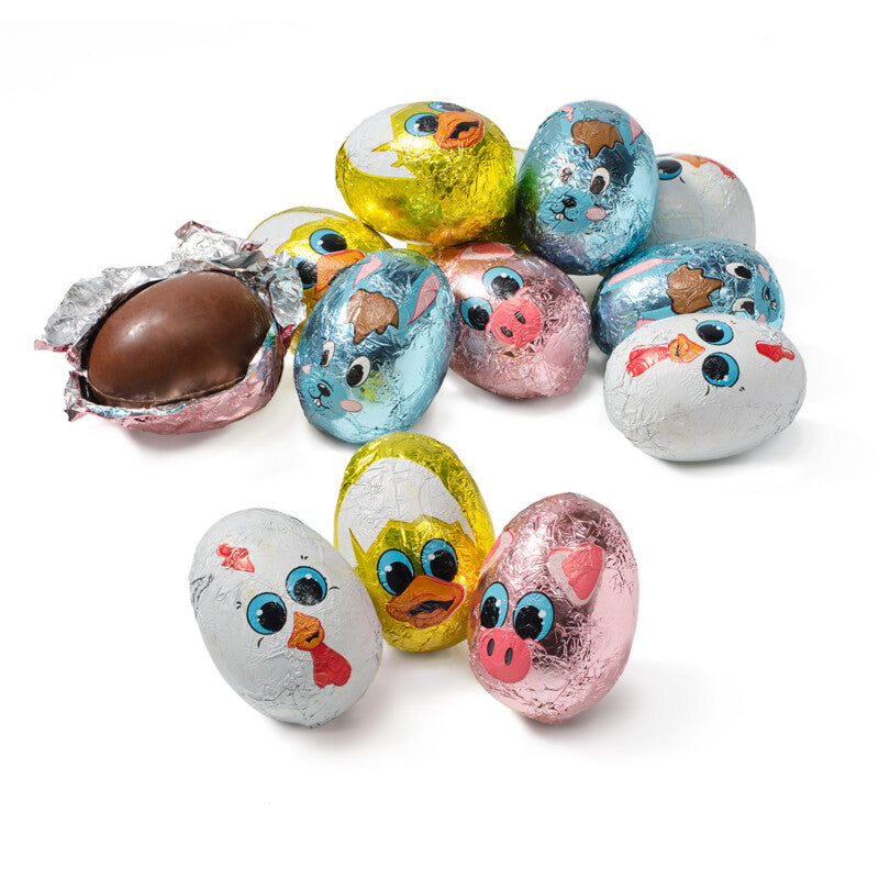 These hollow milk chocolate eggs are similar in size to chicken eggs. With animal print wrapping foil.