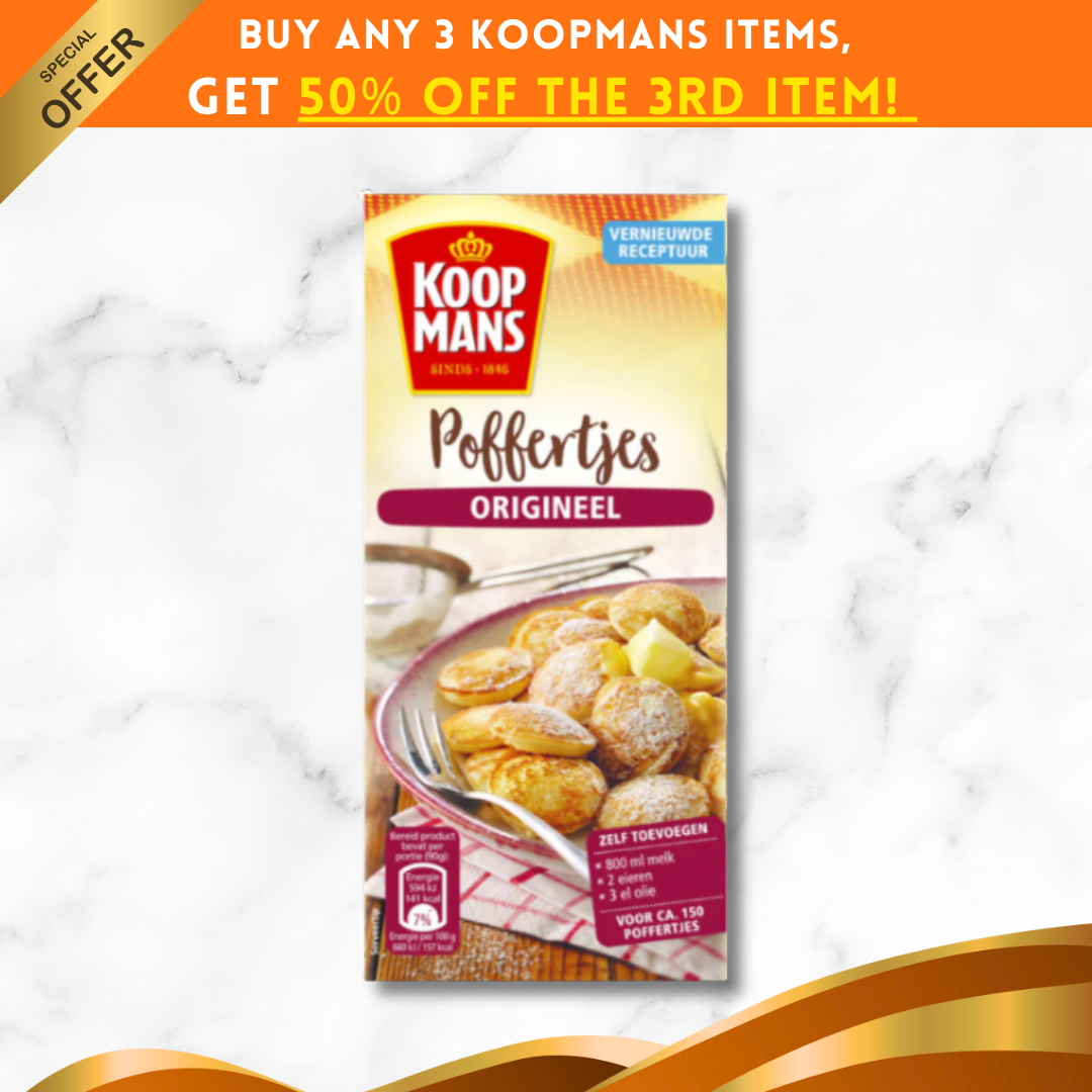 With Koopmans mix for poffertjes you can easily and quickly make a delicious bowl of old-fashioned poffertjes! Delicious with a knob of butter and icing sugar.