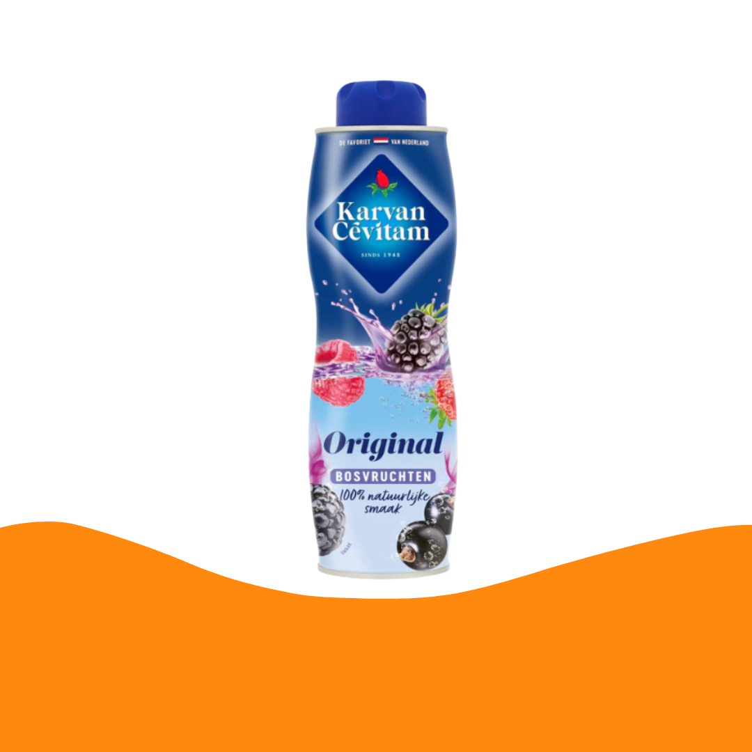 Karvan Cevitam Siroop Bosvruchten 是來自荷蘭的經典森林水果味濃縮糖漿,以多種莓果(如藍莓、黑加侖子、覆盆子等)精華調配,味道天然清甜,富含維他命C。這款糖漿適合用來沖調果味飲品,只需1份糖漿加5至7份水或梳打水,即可製作出一杯清新可口的森林水果飲品。每瓶可沖調多杯美味果汁,適合全家大小享用。