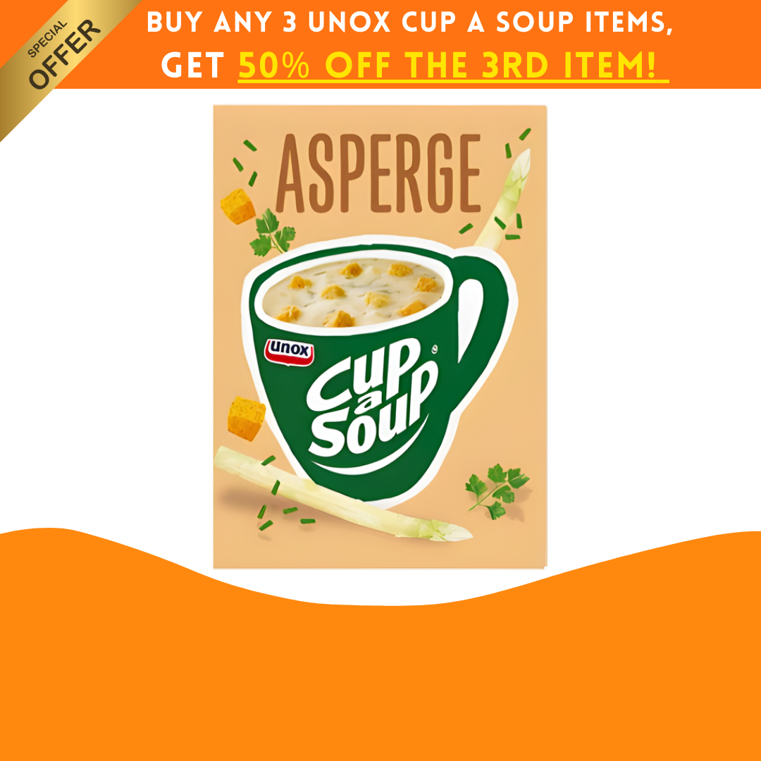 Unox Cup-a-Soup Asperge 是荷蘭人氣即沖露筍湯,只需加入熱水即可在數分鐘內享用香濃順滑的湯品。這款湯以細緻白露筍為主,融合香草與奶香調味,帶來清新柔滑的口感。無論作為午餐、下午茶小食或工作間的暖心飲品,都是輕鬆美味又方便的選擇。每盒包含3包獨立份量包裝,方便攜帶,即沖即飲。