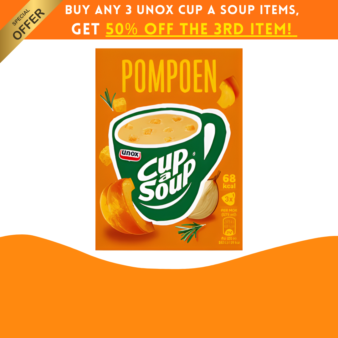 Unox Cup-a-Soup Pompoen 是荷蘭人氣即沖湯品,以新鮮南瓜與香草調味,帶出香甜柔滑的口感。這款南瓜湯質地順滑細膩,甜中帶鹹,完美平衡風味,無論在辦公室、家中或旅行途中,只需加入熱水即可在數分鐘內享受一碗溫暖濃郁的荷蘭風味南瓜湯。每盒包含3包獨立份量包裝,輕巧方便,即沖即飲。