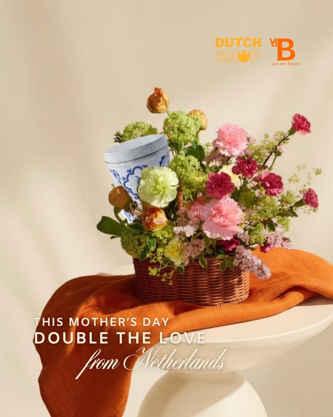 Sunday Picnic - A delightful Dutch collaboration of fresh blooms and premium Stroopwafels. Featuring the signature Delfts Blue Tin filled with authentic Caramel Stroopwafels, nestled beautifully in a handcrafted flower basket by van der Bloom.